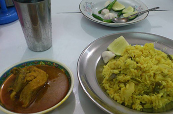 バングラデシュは農業が中心の国で、お米がたくさんできます。バングラデシュの人々はお米といっしょにカレーを食べます。食事のときにはおはしやスプーンは使わず、右手で食べます。