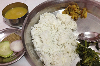 ネパールの人々は主にお米と一緒に豆のスープやカレーを食べます。食事のときにはおはしやスプーンは使わず、右手で食べます。ネパールには多くの民族がすんでいるため、日本の餃子のような「モモ」という食べ物など、カレー以外の食べ物もたくさんあります。