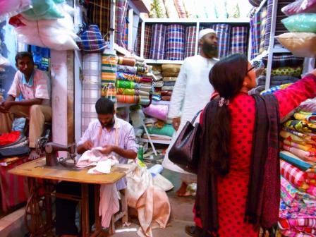 その中の一軒を勘で決め、一度大きく深呼吸。ベンガル語を勉強しているとはいえ、まだまだ若葉マークの初心者。「ちゃんと通じるかなあ。。。」とおそるおそるミシン掛けしている左手前のおっちゃんに話しかけてみました。