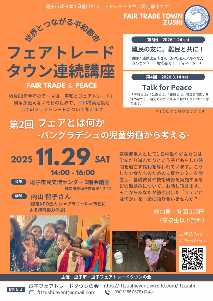 10月から始まった全国キャラバン2025もいよいよ最終回。今回、お世話になったのは逗子フェアトレードタウンの会。逗子市のフェアトレードタウン連続講座、第2回『フェアとは何か-バングラデシュの児童労働から考える』として11月29日に実施しました。