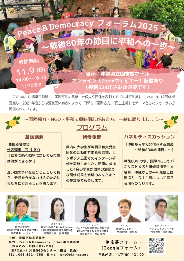 2021年度からは受賞団体有志によって「平和」「国際協力」「民主主義」をテーマとしたフォーラムが開催されています。今年度は、基調講演、県内の大学生が沖縄平和賞受賞団体の活動地である東京都、カンボジア王国でのインターン研修を実施した研修内容の報告、国際NGOパネリストとのパネルディスカッションを行います!オンライン配信もありますので、国際協力・NGO・平和に興味関心がある方ぜひご参加ください。