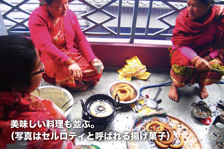 お祭りを大切にするネパールの人々にとって、ティハールは楽しみな行事のひとつです。家族で集まり、みんなでお祈りをして、歌を歌ったり美味しいものを食べて楽しみます。