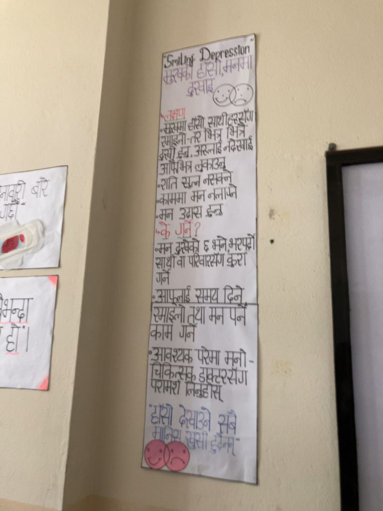 「研修で学んだことを活かし、子どもたちの居心地が良くなるよう保健室内を装飾しています。この壁に飾っているのは”Smile and dipression”の説明です。表面上では笑顔でいても、心の中では悲しんでいる・落ち込んでいる子がいるかもしれない、そういった子に周りの人がきちんと気がつけるように、そしてもし自分がそのような状態にある人は誰かに相談してほしい、ということを伝えています。​」