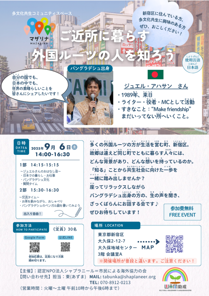 9月6日(土)「マザリナ」は、ゲストスピーカーにバングラデシュ出身のジュエル・アハサンさんをお迎えし、バングラデシュの文化や言葉にふれるお話し会を開催しました。