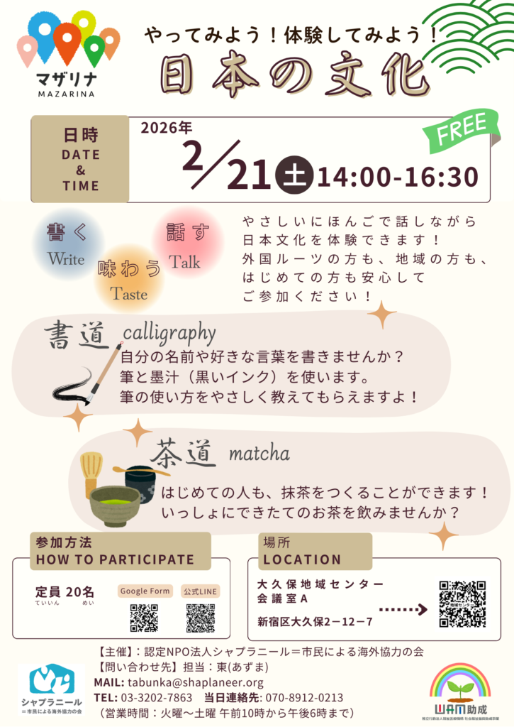 今回の書道と茶道の企画は、さまざまなエッセンスがぎゅっとつまった時間となりました。両方とも作法や所作、礼儀を大切にする文化ですが、今回はその魅力を気軽に楽しむことができる場となりました。春を迎えるように、外国ルーツの方々も含め、参加した皆さんの心がゆるりとほどけていくような、静かなひとときでした。