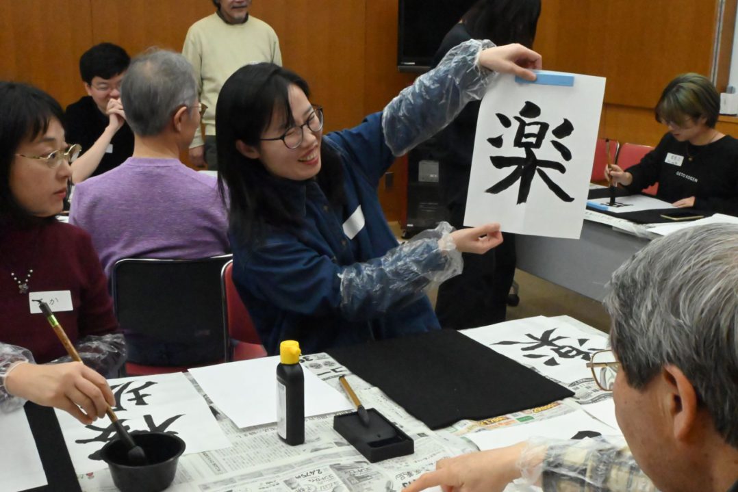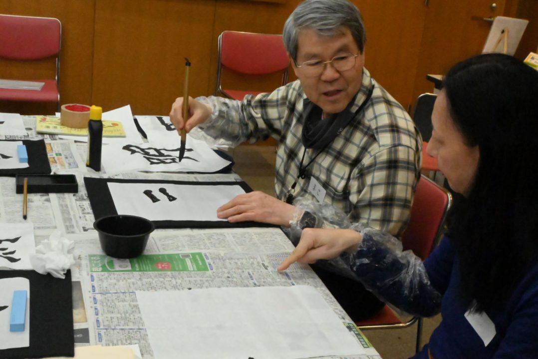 新しいことに挑戦する期待を胸に真剣に筆を動かす姿に、参加者の方が筆の動かし方のコツを教えてくれる場面も見られました。
