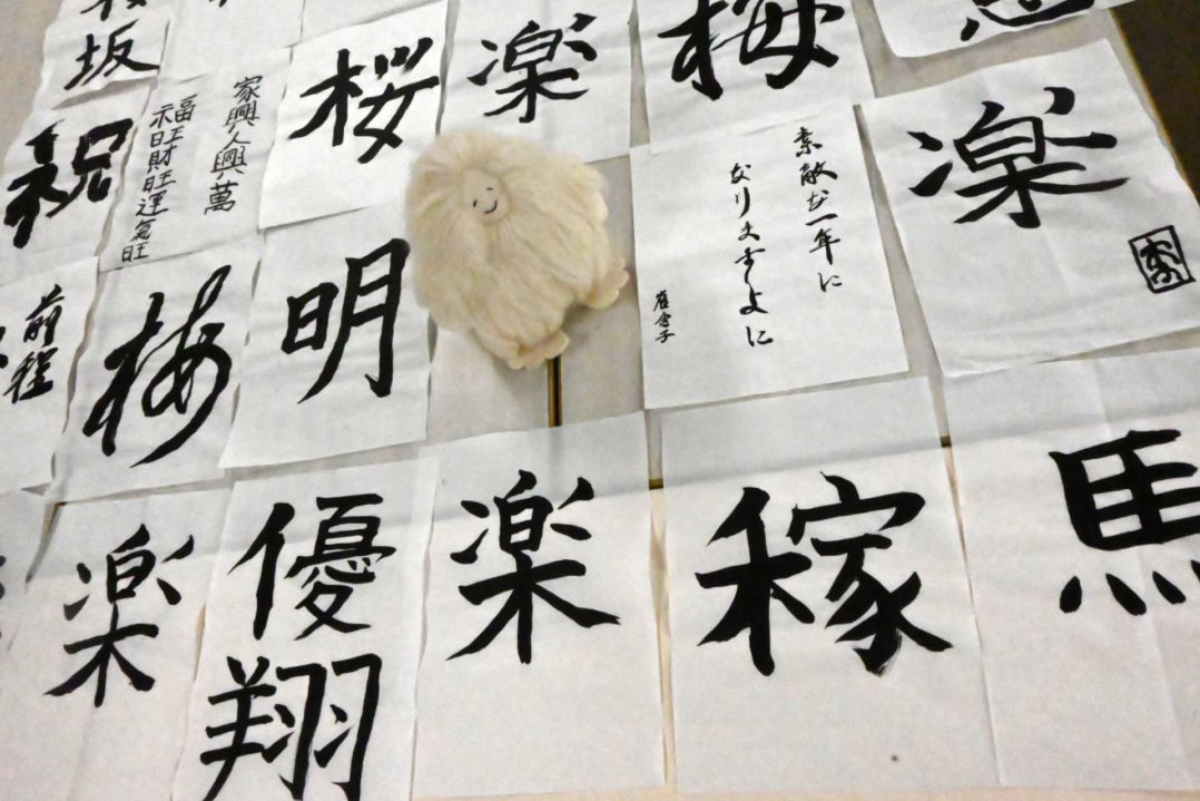 今年を象徴するものや季節の漢字等、真剣なまなざしで、筆先を動かしていきます。